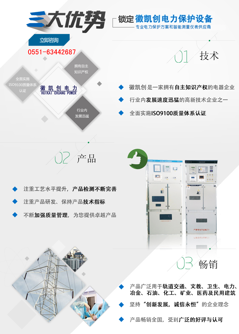 安徽徽凱創(chuàng)電力保護設備有限公司主要從事新型電氣設備、電子設備、智能控制技術(shù)的產(chǎn)品研發(fā)、生產(chǎn)、銷售。主要產(chǎn)品有:智能型消弧消諧裝置、消諧過電壓抑制柜、 組合式過電壓保護、智能型開關(guān)柜智能操控裝置、微機消諧、小電流選線、電弧光保護裝置、智能在線絕緣監(jiān)測裝置等電氣產(chǎn)品。 產(chǎn)品廣泛用于石化、煤炭、電力、建筑、市政、機場、鐵路、醫(yī)院、學校等領域,受到用戶一致好評。